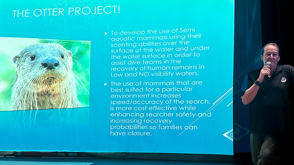 Splash uses scent to help with recovery efforts, using what Hadsell called the “bubble technique.” As Splash searches, he blows bubbles, and the bubbles collect scents from the water. Splash then eats his own bubbles, and he can taste the scent molecules. If he detects a scent that matches what he’s supposed to find, he alerts Hadsell by tapping on his dive mask and leads him to the source.