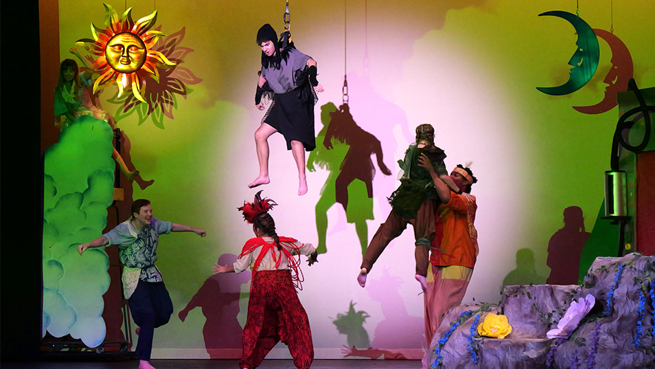 Throughout the show, the cast roamed the stage and aisles, using every inch of Falk Theatre for an immersive story about children who lose a little bit of their youth every time a wish, like being able to fly, is granted by Jolly Goodday. At the beginning, one actor was suspended in a harness above the stage to simulate flying like a butterfly, taking advantage of even the vertical space in the theatre.