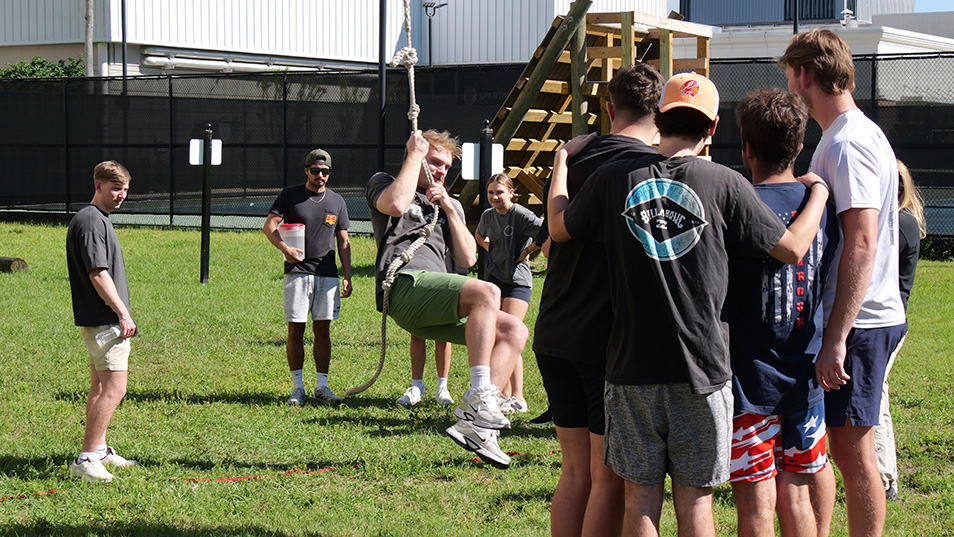 Students took part in the swinging rope challenge on the leadership course on campus. Photo by Juliana Musap '26